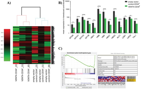 Figure 1. A. Heatmap of differentially expressed genes as determined by RNA-seq between CD34+ CB cells overexpressing VENTX compared to the empty vector control (n=3). B. Differentially expressed genes transcription factors, which are known to play a role in erythroid development. ****: p<0.0001, ***: p≤0.0001, **: p≤0.001. C. Gene set enrichment analysis of genes involved in erythropoietic differentiation.