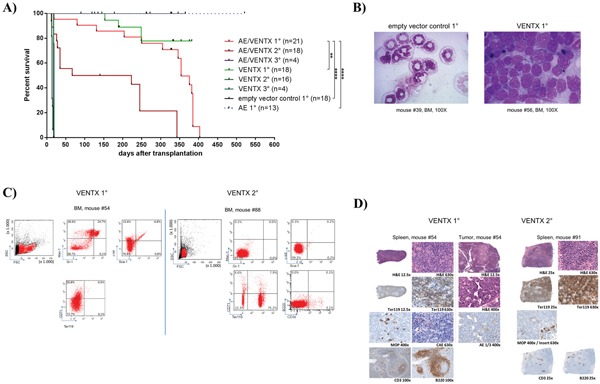 Figure 4. A. Kaplan-Meier survival curves of mice transplanted with 5-FU stimulated transduced BM cells expressing AML1-ETO+VENTX [AE/VENTX 1°] (n=20), VENTX [VENTX 1°] (n=18), empty vector control (n=18) and AML1-ETO [AE 1°] (n=15). Secondary and tertiary transplantations are shown for leukemic mice: AE/VENTX 2° (n=14), AE/VENTX 3° (n=9), VENTX 2° (n=19), VENTX 3° (n=4). AE/V 1° - V 1° V = VENTX: **, p= 0.0011; AE/V 1° - empty vector control 1°: ****, p<0.0001; AE/V 1° - AE1°: ****, p <0.0001; V 1° - empty vector control 1°: n.s. (n.s. = not significant); V 1° - AE1°: ns; AE/V 2° - V 2°: ns; AE/V 3° - V 3°: ns. B. Representative cytomorphological analyses of bone marrow of a diseased VENTX transplanted 1° mouse compared to an empty vector control mouse. C. Representative flow cytometric analysis of a primary VENTX recipient mouse (left side) and a secondary VENTX recipient mouse (right side) D. Histological analysis of primary (left side) and secondary (right side) VENTX recipient mice.