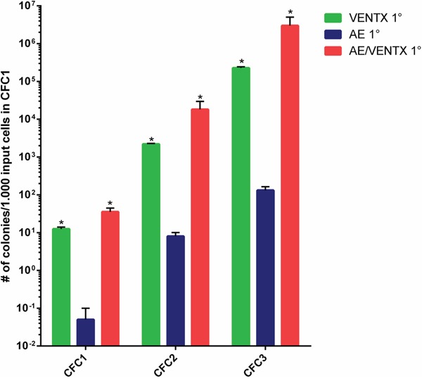 Figure 6. Ex vivo colony forming cell assay (CFC1) and re-plating assays (CFC2, CFC3) of leukemic cells isolated from mice transplanted initially with 5-FU BM cells transduced with the different constructs as indicated. Results are means ± SEM. The number of CFC refers to 1000 input cells in the primary CFC assay. For 2° and 3° CFC assay also the CFC numbers are indicated per initially plated 1000 cells for the primary CFC (*: p≤0.05).