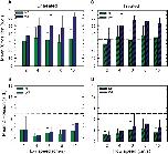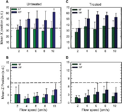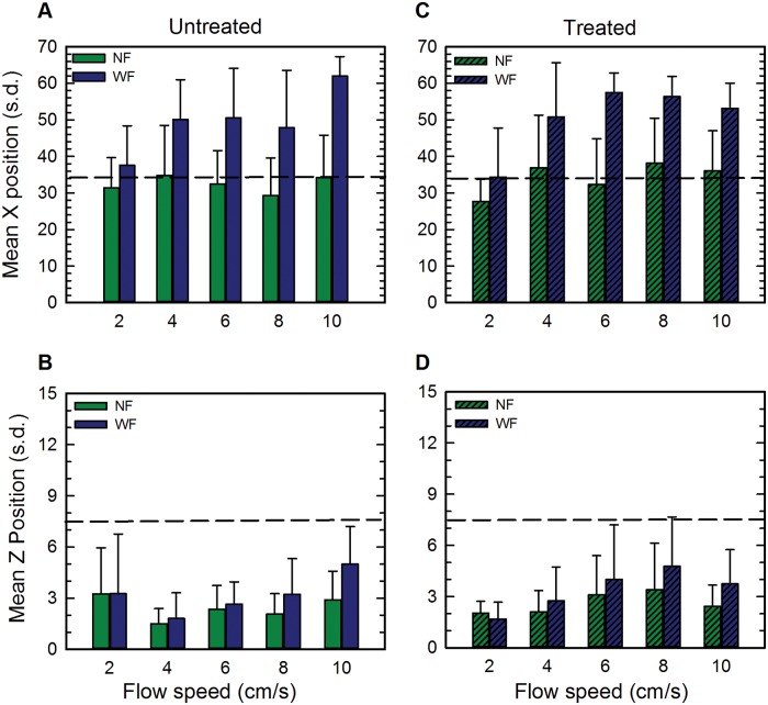 Fig 1. XZ spatial position at different flow speeds in Experiment 1 (tadpoles tested in the dark).(A) Untreated tadpoles, X position. (B) Untreated tadpoles, Z position. Solid green bars show position in NF (No Flow) and solid blue bars show position in WF (With Flow). (C) Treated tadpoles, X position. (D) Treated tadpoles, Z position. Hatched green bars show position in NF and hatched blue bars show position in WF. All positions are shown as mean +/- standard deviation. The horizontal dashed line on each plot shows the midpoint of the tank in that dimension. Both untreated and treated tadpoles move towards the back of the tank in the X dimension (A,C) and farther up in the water column in the Z dimension (B,D).
