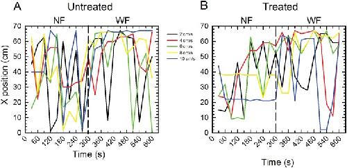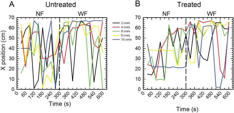 Fig 2. Changes in X position of individual tadpoles during NF and WF periods.(A) Untreated tadpoles. (B) Treated tadpoles. The NF period extends from 30 to 300 seconds and the WF period extends from 330 to 600 seconds. Flow is turned on at 300 seconds (vertical dashed line on each plot). Each colored line shows data from one tadpole at one flow speed. Tadpoles do not station hold in NF or in WF. Streamwise movements were reduced at a flow speed of 10 cm/s although crosswise movements still occurred. Tadpoles initiated movements within the first 30 second time interval after the flow is turned on, and change in movements were similar for untreated and treated tadpoles.