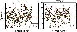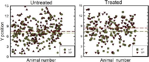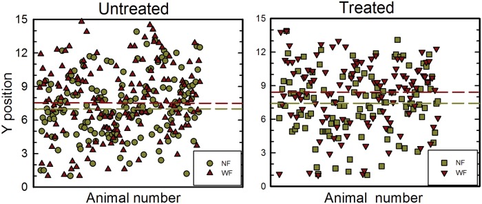 Fig 3. Y positioning of individual tadpoles during NF and WF periods.(A) Untreated tadpoles. Each data point shows the mean Y position of one tadpole over the NF period (dark yellow circles) and over the WF period (dark red triangles). Data are not separated by flow speed, because data points overlapped substantially. Over all tadpoles, the mean Y position in NF is 7.2 and the mean Y position in WF is 7.6, as shown by the color-coded dashed lines. (B) Treated tadpoles. Data in NF are shown as dark yellow squares and data in WF are shown as dark red inverted triangles. The mean Y position in NF is 7.5 and the mean Y position in WF is 8.3, as shown by the color-coded dashed lines. Tadpoles are more clustered towards the middle of the tank in NF than in WF, with treated tadpoles positioned farther towards one side in WF.