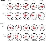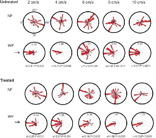 Fig 4. Orientation headings at different flow speeds in Experiment 1 (tadpoles tested in the dark).Circular plots (in degrees) showing orientation headings for untreated (A) and treated (B) tadpoles tested in NF (top row) and WF (bottom row) at different flow speeds (columns). The top NF plot (untreated, 2cm/s) shows the circular reference points (in degrees). The arrows on the left of the WF plots point to 0°, the crosswise midpoint of the source of the flow. An animal showing perfect positive rheotaxis would be oriented towards 0°. Red triangles (bin width of 5°) in each plot show the mean orientation, summed over ten time intervals (300 second total sampling time), of each individual tadpole. The length of the triangles indicates how many individual tadpoles exhibited that particular orientation. The numbers inside the circular plots in WF are the vector strengths of the orientation response. Results of the modified Rayleigh test (u, with corresponding P values) are shown below these plots. P values of 0.001 or below are statistically significant, according to our criterion. Statistical significance was not obtained in any NF condition.
