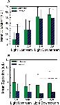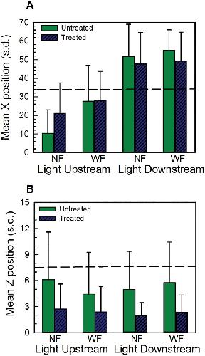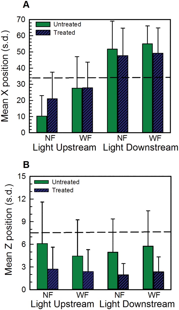 Fig 5. Spatial positioning in XZ dimensions in Experiment 2 (testing in the presence of a light cue).(A) Mean (+/- standard deviation) X positioning. (B) Mean (+/- standard deviation) Z positioning. Light location (upstream or downstream) and flow condition (NF, WF) are indicated on the x axis. In all plots, the dashed line shows the midpoint of the tank in that dimension. Untreated tadpoles are shown by the dark green bars and treated tadpoles are shown by the hatched dark blue bars. The presence and location of the light cue strongly affects positioning in the X dimension, while treatment affects positioning in the Z dimension.