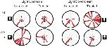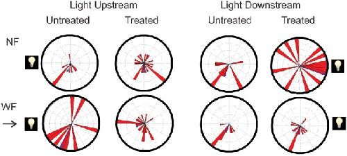 Fig 6. Orientation headings in Experiment 2 (testing in the presence of a light cue).Circular plots showing orientation headings of tadpoles tested in NF (top row) and WF (bottom row) in two light conditions (columns). Data are shown separately for untreated and treated animals. Tadpoles were not significantly oriented towards the location of the light cue (shown by the light symbol) or towards the source of the flow (in WF).