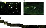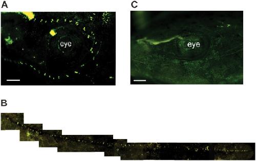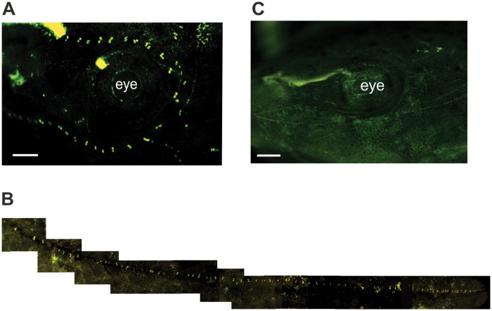 Fig 7. DASPEI-stained neuromasts in bullfrog tadpoles.(A) Supra- and infra-orbital lines in an untreated stage 26tadpole. Rostral is to the right. Scale bar = 1mm. (B) Composite of images from the tail of an untreated stage 25tadpole. The trunk is to the left and the tip of the tail is to the right. (C) Supra- and infraorbital lines in a gentamicin-treated stage 26tadpole. In all images, DASPEI fluoresces yellow. Images have been adjusted for brightness, contrast and color balance.