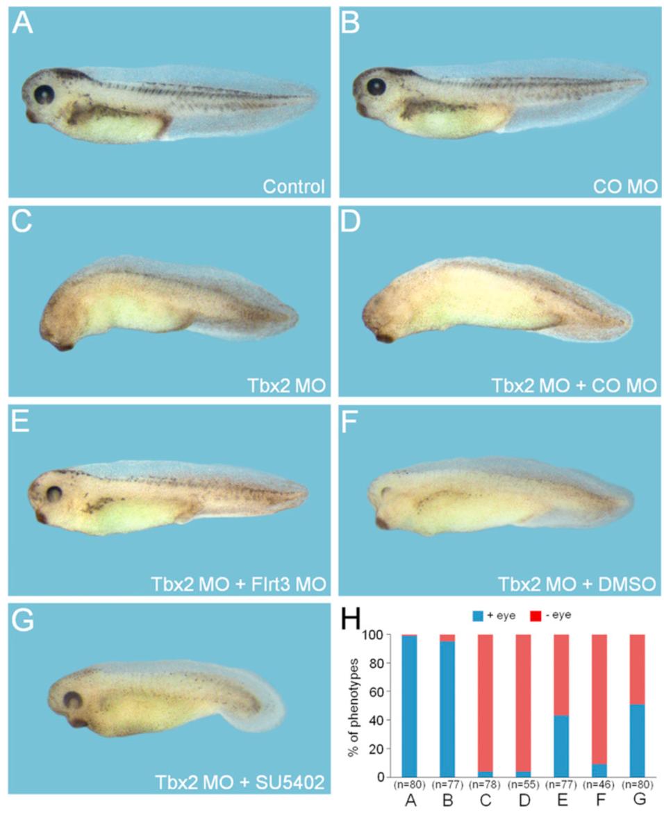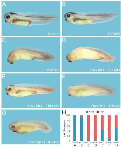 Tbx2 inhibition of FGF signaling is critical for formation of head structures. (A-G) Four-cell stage embryos were injected in the animal region as indicated with Tbx2 MO (40 ng), CO MO (60 ng) and Flrt3 MO (60 ng) and cultured to tadpole stages with or without chemical treatment. SU5402 (20 μM) or DMSO was treated to the injected embryos from stage 15â20. Control, an uninjected embryo. Lateral views with anterior to the left. (H) Quantification of the phenotypes shown in (A-G) in terms of eye formation. n, the total number of embryos analyzed. + eye, embryo with eyes; - eye, embryo with no eyes.