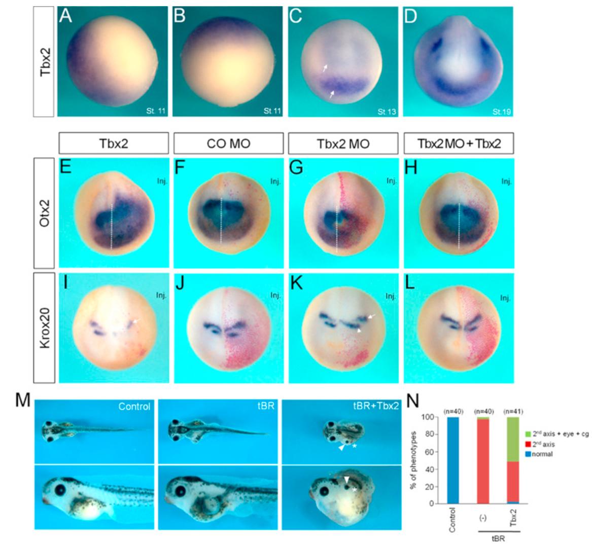 Tbx2 is critical for anterior neural development. (A-D) Whole-mount in situ hybridization analysis showing the expression pattern of Tbx2 at the gastrula and neurula stages. (A) Lateral view, anterior to the left. (B) Dorsal view, anterior to the top. (C, D) Anterior view, dorsal to the top. (E-L) Four-cell stage embryos were injected dorso-animally with Tbx2 (200 pg), Tbx2 MO (10 ng) and CO MO (10 ng) as indicated, cultured until stage 16â17 and then subjected to in situ hybridization against Otx2 or Krox20. LacZ RNA (100 pg) was co-injected as a lineage tracer. All embryos are shown in anterior view with dorsal to the top. Inj. denotes the injected side of embryo. (M) For axis duplication assays, embryos were injected in the ventral region with tBR (100 pg) alone or with Tbx2 (200 pg) and cultured to tadpole stages. Arrowheads and asterisks indicate eye and cement gland, respectively. (N) Quantification of axis duplication assays shown in (M). n, the total number of embryos analyzed. 2 nd axis, a partially duplicated axis; eye, a secondary eye; cg, a secondary cement gland; normal, normal embryos with single body axis.