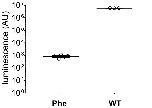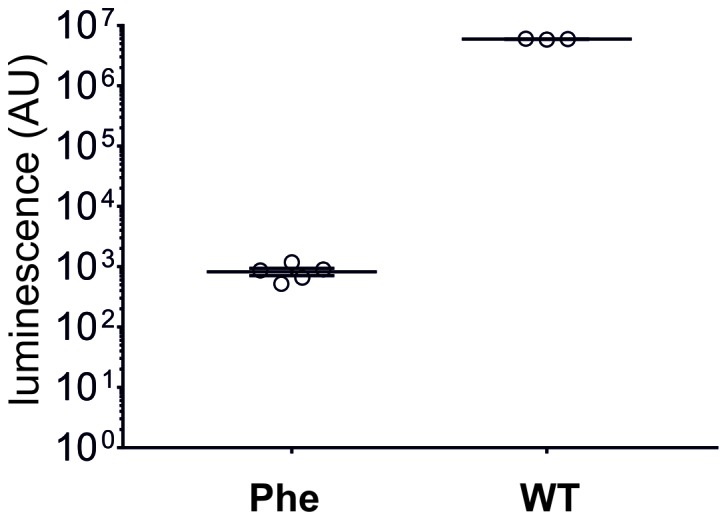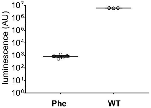 Figure 2—figure supplement 2. In eukaryotic cell-free translation system, the yield of nonsense suppressed NanoLuc Amber (Phe, N = 5, same data as in Figure 2B) is roughly 7000 times lower than for wild-type NanoLuc (WT, N = 3).Individual values are shown with corresponding mean ± s.e.m.DOI: http://dx.doi.org/10.7554/eLife.19088.010 |