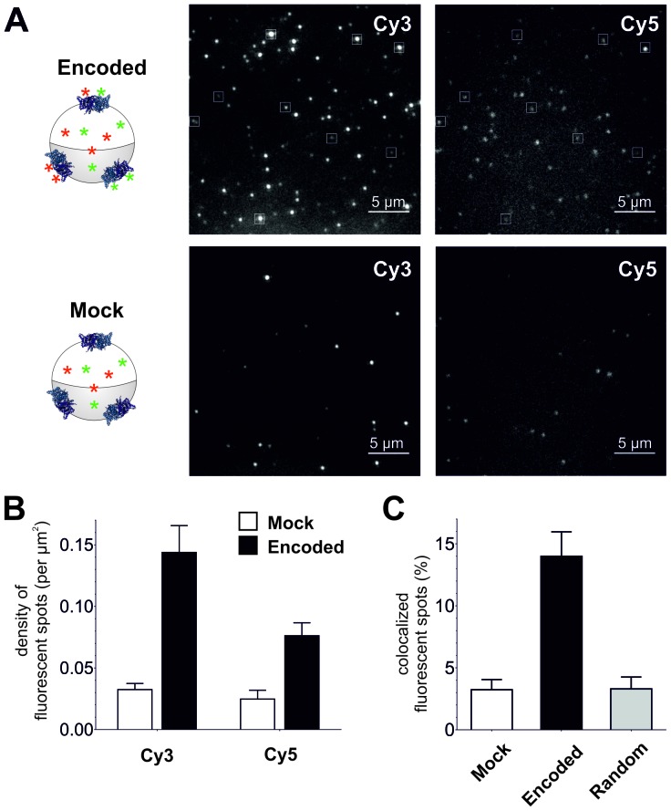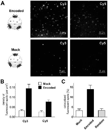 Figure 5—figure supplement 1. Photo-bleaching profiles for Cy3 and Cy5 spots in Encoded and Mock.For clarity, results from Figure 5C are shown here as relative photo-bleaching event distributions. In each case, the Encoded conditions produce a statistically significant difference (p<0.0001) over Mock distributions. All values are mean ± s.e.m. In total, following numbers were included: N = 1564 for encoded Cy3, N = 762 for encoded Cy5, N = 296 for mock Cy3, N = 300 for mock Cy5.DOI: http://dx.doi.org/10.7554/eLife.19088.016 |