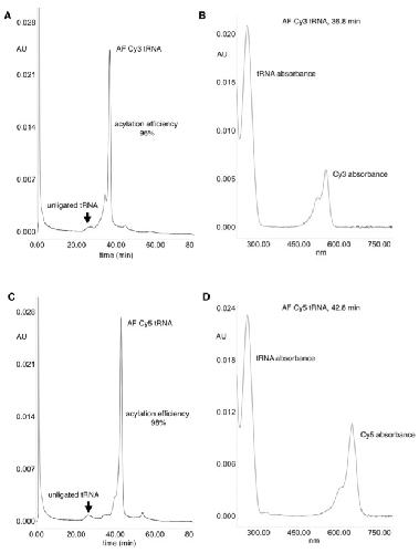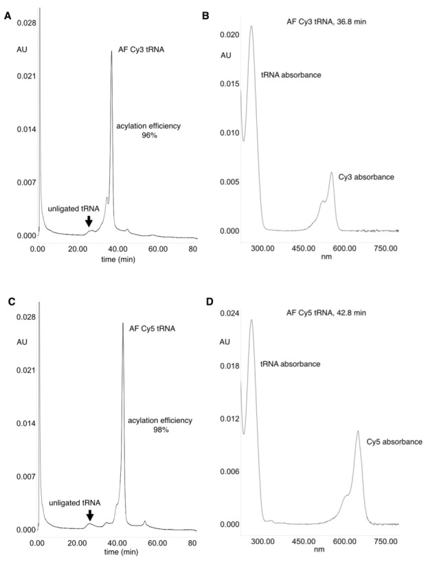 Figure 2—figure supplement 1. HPLC purification of acylated pyrrolysine tRNA (PylT).(A) HPLC chromatogram at 260 nm showing a trace of non-acylated and Cy3-AF-acylated PylT at 36.8 min, with 96% acylation efficiency based on area-under-peaks. (B) UV absorbance spectrum of Cy3-AF-acylated PylT. (C) HPLC chromatogram at 260 nm showing a trace of non-acylated PylT and Cy5-AF-acylated PylT at 42.8 min, with 98% acylation efficiency based on area-under-peaks. (D) UV absorbance spectrum of Cy5-AF-acylated PylT. Utilizing a PylT ε260 value of 690,000 M-1cm-1 (http://www.idtdna.com/calc/analyzer) the ratio of tRNA to functionally ligated Cy dyes (using Cy3 ε550 of 150,000 M−1cm−1 and Cy5 ε650 of 250,000 M−1cm−1) was calculated. The ratios of the HPLC UV absorbances at 260 nm and 550/650 nm were compared to the ε260 and ε550/ ε650 values and were both found to be within 30% of the theoretical 1:1 tRNA:CyX ratio.DOI: http://dx.doi.org/10.7554/eLife.19088.009 |
