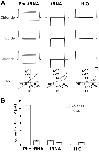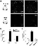 Figure 5. Photo-bleaching profiles for Cy3 and Cy5 spots in Encoded and Mock conditions.(A) and (B) Photo-bleaching events of Cy3 and Cy5 fluorescent spots in the Encoded sample. (A) Example of a 5-step photo-bleaching event of a fluorescent spot showing Cy3 (top) or Cy5 fluorescence (bottom), respectively, in an oocyte co-injected with ClC-0 E166TAG cRNA as well as Cy3- and Cy5-tRNA. A single representative frame was selected from the video sequence showing step-wise reduction in spot-intensity. Presented area size is 20 pixels x 20 pixels. (B) Examples of fluorescence traces (in arbitrary units, AU) as a function of time show step-wise photo-bleaching for Cy3 (left) and Cy5 (right), respectively, until complete photo-destruction of the fluorophore was achieved. Arrows indicate observed steps during the bleaching process; N is equal to the total number of identified steps. (C) Photo-bleaching histogram for Cy3 and Cy5 spots in Encoded and Mock reveal a distribution distribution of steps: while in Mock 1-step events strongly dominated, in Encoded the distribution was clearly shifted towards 2+ steps. Values represent absolute numbers for the identified bleaching step event analyzed from an equal number of frames for each condition (five oocytes, three batches). In total, following numbers were included: N = 1564 for encoded Cy3, N = 762 for encoded Cy5, N = 296 for mock Cy3, N = 300 for mock Cy5.DOI: http://dx.doi.org/10.7554/eLife.19088.015Figure 5âfigure supplement 1. Photo-bleaching profiles for Cy3 and Cy5 spots in Encoded and Mock.For clarity, results from Figure 5C are shown here as relative photo-bleaching event distributions. In each case, the Encoded conditions produce a statistically significant difference (p<0.0001) over Mock distributions. All values are mean ± s.e.m. In total, following numbers were included: N = 1564 for encoded Cy3, N = 762 for encoded Cy5, N = 296 for mock Cy3, N = 300 for mock Cy5.DOI: http://dx.doi.org/10.7554/eLife.19088.016 |