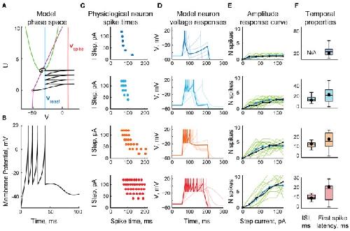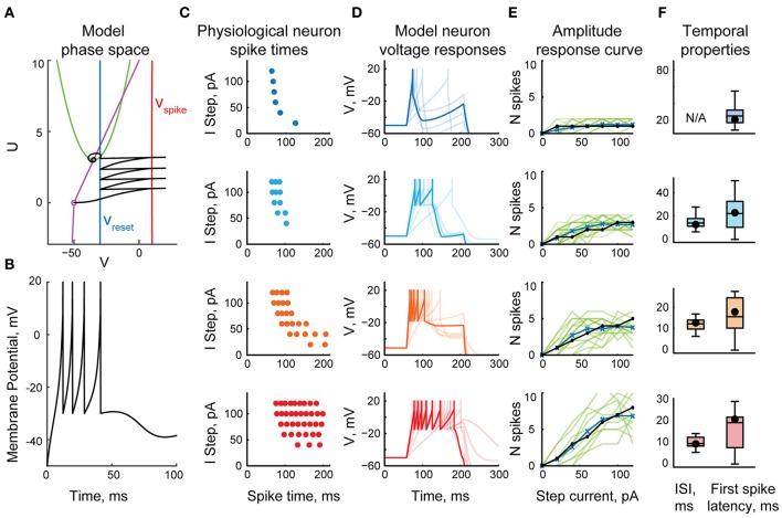 Figure 1. The fast-inactivating spiking model of a tectal neuron. (A) The phase space of a system of two differential equations representing a spiking neuron, showing a sample trajectory in this space (black), two nullclines (purple and green), and the values involved in potential reset during spiking (Vspike in red, and Vreset in blue). (B) A typical response of a model neuron to a step current injection. (C) Spike-time rasters of four representative physiological neurons from Ciarleglio et al. (2015) as they spike in response to current clamp steps of amplitudes from 20 to 120 pA. (D) Voltage traces of four model neurons in response to current steps of amplitudes from 20 to 120 pA. Responses to 80 pA current step are highlighted. (E) Input-output curves, showing the number of spikes generated by neurons in response to current step injections of different amplitudes, for four representative spiking groups separately. Response curves of individual biological neurons from Ciarleglio et al. (2015) are shown in green, averages for biological neurons in blue, model neuron responses in black. (F) Distributions of first spike latencies (left) and first-to-second inter-spike intervals (right) during responses of biological neurons to step current injections of 100 pA, with similar values for model neurons superimposed on them (black dots). |