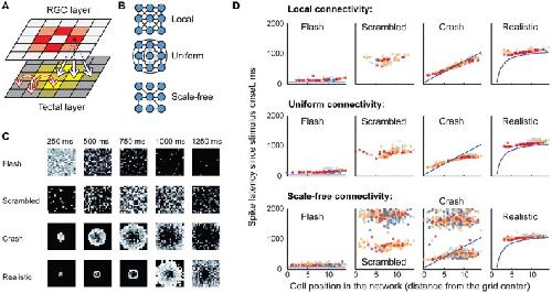 Figure 2. Network model, retinal inputs, and network responses. (A) The basic topology of the model network: a grid of retinal ganglion cells (RGCs) made a “blurred” retinotopic projection to the tectal layer (black arrows), with recurrent connections within the tectal layer (red arrows). Different colors schematically show relative activation of RGCs and tectal cells during visual stimulus processing. (B) Three possible options for the recurrent intra-tectal connectivity: local (neurons are connected only to their neighbors); uniform (connections between any two neurons are equally probable); and scale-free (small-world network with highly connected hub cells). (C) Snapshots of RGC layer spiking, representing four visual stimuli: instantaneous full-field flash; randomly rearranged (scrambled) looming stimulus; linearly expanding looming stimulus (crash); and realistic non-linearly expanding looming stimulus. Each square shows a “still frame” from a dynamic response, taken in 250 ms increments after the stimulus onset (0 ms); with more recent spikes within each 250 ms window shown in lighter shades of gray. (D) Sample rasters of spiking responses in the tectum, generated for different recurrent connectivity profiles (rows), and different visual stimuli (columns). The horizontal axis presents model cell positions as distance from the 20 × 20 grid center; vertical axis shows spike latency; blue lines for crash and realistic stimuli show the theoretical time at which each tectal cell is directly engaged by the visual stimulus through the corresponding retinal cell. Cells of different spiking phenotypes are shown in different colors, from most spiky (red) to least spiky (dark blue). |