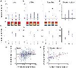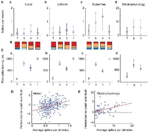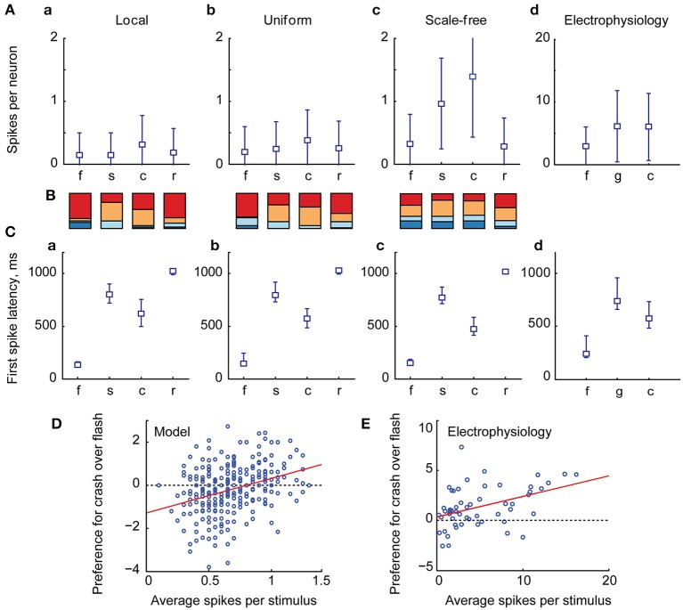 Figure 3. The summary statistics of spiking output in the tectum. (A) Averages (markers) and standard deviations (error bars) of the number of spikes per neuron generated by the tectum during responses to different visual stimuli, in models with different recurrent connectivity profiles (A–C), and in physiological data [D, data from Khakhalin et al. (2014) Figure 4]. Here “f” stands for “flash,” “s” for “scrambled,” “c” for “crash,” “r” for realistic, and for physiological data “g” stands for “grid” (a stimulus that can be considered analogous to the “scrambled” stimulus from the model); responses were respectively modeled or recorded for 2s after stimulus onset. Both in computational and biological experiments looming stimuli evoked stronger responses than an instantaneous flash (paired t-test p = 5e−66, n = 400 for the model, p = 1e−5, n = 56 in physiological experiments; significant after Bonferroni correction), while spatially disarranged stimuli evoked intermediate responses (B). The relative contribution of different neuronal spiking phenotypes to model responses, measured as the total number of spikes generated by all 10-spike (red), 5-spike (orange), 3-spike (light blue), and 1-spike (dark blue) neurons. Medium-spiking neurons were more involved in responses to slow than to fast stimuli (C). The median and inter-quartile ranges of first spike latencies during tectal responses to different stimuli, in model networks with different connectivity profiles (A–C), and in biological experiments (D), data from Khakhalin et al. (2014), not previously presented). The model successfully predicted typical latencies observed in physiological experiments (all pairwise comparisons between responses to different stimuli p < 1e−6, paired t-test, significant after Bonferroni correction). (D) The average number of spikes generated by model neurons across all four visual responses correlated (r = 0.31) with their preference (Cohen d effect size) for looming stimuli (crashes) over flashes; regression line shown in red (E). A similar analysis for the physiological data from Khakhalin et al. (2014) verified this prediction, as spikier neurons preferred looming stimuli to flashes (r = 0.42). |