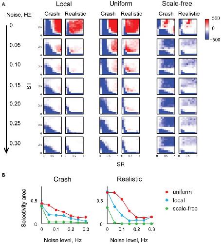 Figure 5. Neuronal noise reduces selectivity to looming stimuli, and makes the balance of direct and recurrent inputs more important. (A) Selectivity charts in the (SR, ST) space for different connectivity profiles and two types of looming stimuli (columns), shown for different levels of spontaneous neural noise (rows). As the levels of noise increase (top to down across the panel), the areas of selectivity for looming stimuli become smaller. (B) The share of the parametric space selective to looming stimuli (with arbitrary threshold of F = 10), as a function of neural noise level, for two types of looming stimuli. The share of (SR, ST) combinations allowing looming stimuli detection goes down as noise levels increase, yet uniformly connected network (red) is less sensitive to background noise than either local (blue) or scale-free (green) networks. |