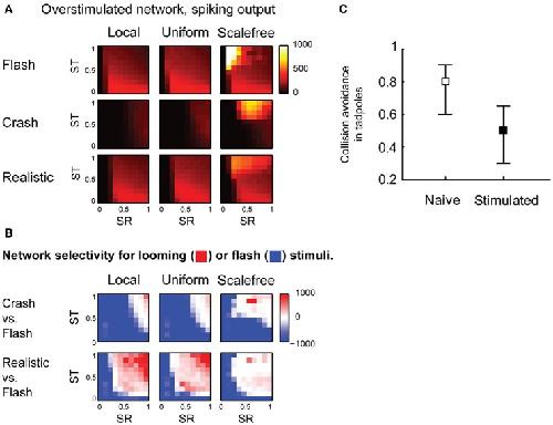 Figure 4. The effect of balance between recurrent and direct inputs to the tectum on stimulus selectivity (A). The total number of spikes (shown as pixels of different color, from black to white) generated in model networks with different strength of direct (horizontal axes) and recurrent (vertical axes) synaptic inputs, for different stimulus types (rows), and recurrent network topologies (columns) (B). The comparison of looming stimuli responses to full-field flash responses. Here color encodes the reliability (signed F-value) of getting a stronger total network response to either looming (red), or flash (blue) stimulus, for different strengths of direct (SR) and recurrent (ST) synaptic inputs. Networks with strong direct and recurrent synaptic inputs are selective for looming stimuli (red in the top right corner), while weakly connected networks are selective for full-field flashes (blue crescents in the left lower corner). This pattern is present, but less pronounced for fast looming stimuli, and in scale-free networks. |