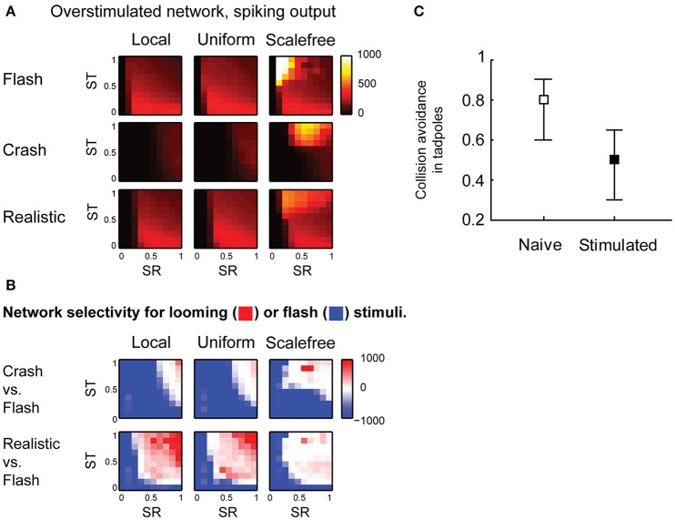 Figure 6. Effects of sensory experience on looming stimulus detection. (A) Compared to naïve networks shown in Figure 4, overstimulated networks spike more in response to fast stimuli (“flash” and “realistic” looming), but not in response to slow “looming” stimuli. Color shows the total number of spikes generated by the network in response to a stimulus (B). Unlike naïve networks, overstimulated networks are not selective for slow looming stimuli (large blue areas in the first row), but retain selectivity for fast “realistic” looming stimuli (red areas in the second row) (C). In behavioral experiments, after prolonged strong visual stimulation tadpoles don't perform avoidance maneuvers in response to slow-moving objects (Mann-Whitney P = 0.003). |