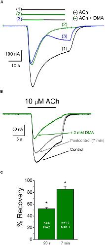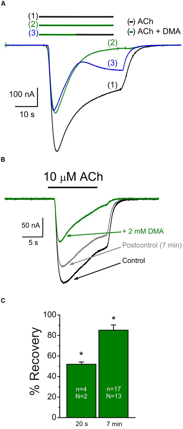 FIGURE 2. Slow recovery from nAChR blockade by DMA. (A) Superimposed IAChs evoked sequentially, in the same oocyte, by superfusing the cell with 10 μM ACh alone [(1), black bar and recording], co-applied with 2 mM DMA [(2), green bar and recording] or when changing from ACh plus DMA to ACh alone at the time indicated by the bars [(3), green followed by black bars and blue recording]. Note the incomplete recovery of IACh amplitude after washing DMA for 20 s. (B) Superimposed currents obtained by superfusing one oocyte with 10 μM ACh alone (Control, black recording) or plus DMA (+ 2 mM DMA, green recording). Seven min after DMA withdrawal (Postcontrol, gray recording), IACh did not fully reach the control amplitude. (C) Column graph showing the percentages of IACh recovery after 20 s or 7 min from DMA washout. Asterisks indicate significant differences respect to the control response. |