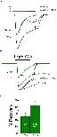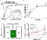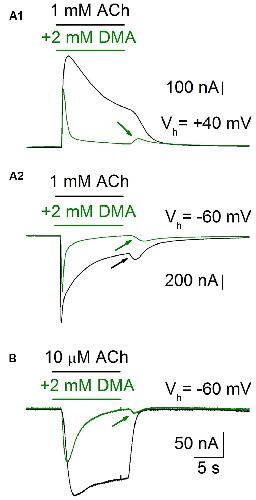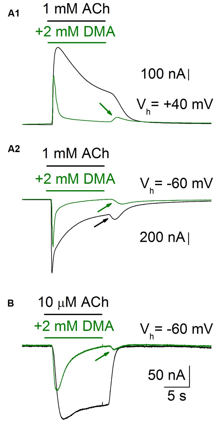 FIGURE 4. IACh rebound elicited by DMA washout. When an oocyte was challenged with a high ACh concentration (1 mM), while holding its membrane potential at -60 mV (Vh = -60 mV), the IACh showed a marked desensitization and a noticeable rebound-current (A2, black recording and arrow) when the agonist was rinsed. By contrast, both when applying the same ACh concentration to the cell at a membrane potential of +40 mV (A1, black recording), or when decreasing the ACh concentration to 10 μM (B, black recording), the IACh rebound was not evoked. However, when ACh was co-applied with 2 mM DMA the IACh rebound was evident at any potential or ACh concentration tested (A1,A2,B, green recordings and arrows). |