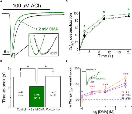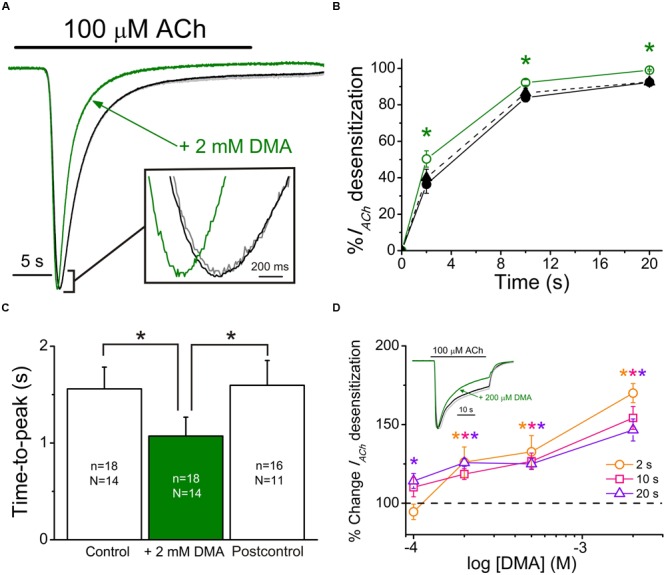 FIGURE 5. 2,6-Dimethylaniline effects on IACh decay and time-to-peak. (A) Superimposed IACh recordings evoked by application of 100 μM ACh either alone (black recoding) or plus 2 mM DMA (green recording) and by re-applying 100 μM ACh alone 7 min after DMA washout (Postcontrol, gray trace overlapping the control one). Note that all IACh amplitudes have been scaled to the same size to better showing differences on IACh desensitization. Inset shows, at an expanded temporal scale, the IACh peaks elicited by ACh either alone or co-applied with DMA. (B) Plots showing the percentage of IACh decay obtained at different times (2, 10, and 20 s) after IACh peak. Data were measured from recordings as those shown in (A), by applying 100 μM ACh either alone (Control, filled circles and continuous black line; Postcontrol, filled triangles and dashed black line) or plus 2 mM DMA (open circles and continuous green line). (C) Column graph showing the IACh time-to-peak values when applying 100 μM ACh either alone (Control and Postcontrol, empty columns) or together with 2 mM DMA (filled green column). Values of n and N, given in each column, are common to (B,C); in both panels, asterisks indicate significant differences among groups (p < 0.05, ANOVA and Bonferroni t-test). (D) Plot displays the DMA dose-dependence of IACh decay hastening. Desensitization values (Dtis) at 2 (orange), 10 (pink) and 20 s (violet) from IACh peaks, elicited by co-applying 100 μM ACh with 100, 200, 500, or 2000 μM DMA, were expressed as percentage respect to their control Dtis and plotted against the log of DMA concentration. Each point is the average of 4â12 oocytes from three frogs. Asterisks of different colors indicate significant differences respect to the control values for the color-coded time (p < 0.05, one sample t-test). Inset shows superimposed recordings evoked by 100 μM ACh either alone or together with 200 μM DMA; recording colors are as in (A) and IACh amplitudes have also been scaled to the same size. |