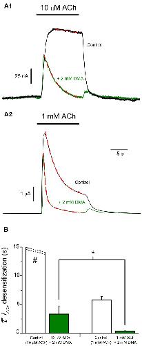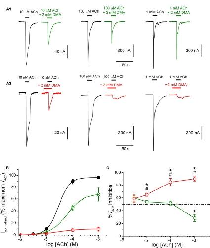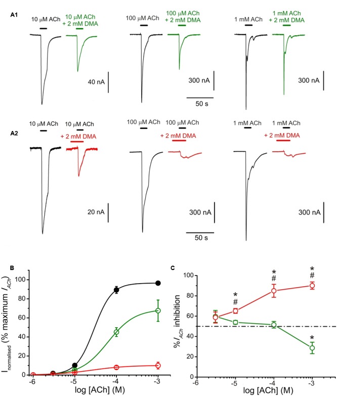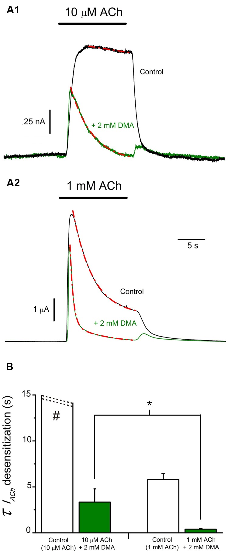 FIGURE 6. IACh decay hastening elicited by DMA is dependent on ACh concentration. (A) Superimposed recordings of IAChs elicited by 10 μM (A1) or 1 mM (A2) ACh either alone (black recordings) or co-applied with 2 mM DMA (green recordings) in oocytes with the membrane potential held at +40 mV. IACh decays were fitted to exponential curves (red discontinuous lines) and the time constant (Ï) values for each group were determined. (B). Column graph of Ï values for IACh decays. Data of each column are mean ± SEM from 4 to 6 oocytes (N = 3). When co-applying DMA and 1 mM ACh, the IACh decay was best fitted to double exponential curves and the Ï value shown in B corresponds to the fast component. Note that both control IACh amplitude and desensitization rate increased with ACh concentration (see black recordings in A1,A2; B, open columns) and mind the presence of rebound-currents when ACh and DMA were co-applied (green records), independently of the ACh dose used. Observe that DMA co-application caused a stronger blocking effect at low (A1) than at high (A2) ACh concentrations and that DMA enhancement of the rate of IACh decay was greater for higher ACh doses (compare recordings of A1, A2; B). The asterisk indicates significant differences between both DMA groups (p < 0,05, t-test), and the pound sign denotes that this column is truncated, because IAChs elicited by 10 μM ACh showed almost no desensitization. |