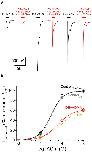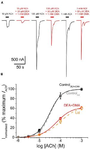 IACh recordings elicited by applying, sequentially, ACh at increasing concentrations (10, 100 μM, and 1 mM) either alone (black traces) or co-applied with 1 mM DMA and 30 μM DEA (red traces). (B) Averaged ACh concentration-IACh amplitude curves attained following the experimental protocol shown in (A). Black filled circles are for ACh alone (n = 4â7, N = 1) and red open circles when ACh was co-applied with DMA and DEA (same cells than the control curve). All data were normalized to the maximal IACh elicited by ACh alone and fitted to Eq. (3). Continuous black and red lines are the fitted curves, labeled as ControlDEA+DMA and DEA+DMA, respectively. Added to this plot are the values we reported for the dose-response curves of nAChRs activated by ACh either alone (gray symbols and discontinuous line; ControlLid) or in the presence of 70 μM lidocaine (orange circles and discontinuous line; Lid; data from Alberola-Die et al., 2011). Notice the similarities among both control curves and between DEA+DMA and lidocaine curves. |