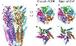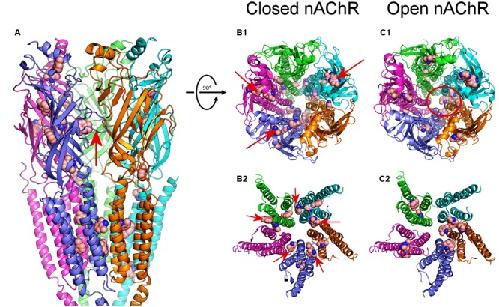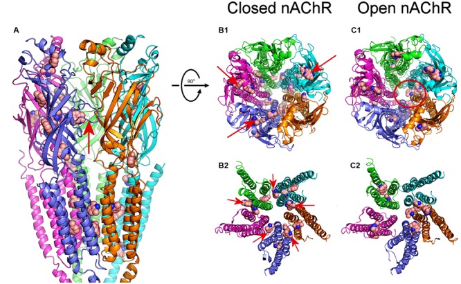 FIGURE 10. Modeling of DMA binding to nAChR EC- and TM-domains in the open and closed states. (A) Lateral view, in the membrane plane (top corresponding to the EC side) of nAChR, in the closed state, with bound DMA molecules. Subunits are colored for this and following panels as follows: α1 (blue), α2 (cyan), β (magenta), γ (orange), and δ (green). DMA molecules are colored brown and represented as van der Waals spheres. Notice that DMA binds both at the EC and TM domains. The red arrow indicates the orthosteric binding site at the α1-γ interface. (B1,C1) Top view (from the synaptic cleft) of nAChR structures in the closed (B1) and open (C1) states with bound DMA molecules. Note that, when closed, at the EC domain, DMA binds to intrasubunit loci (arrows in B1), mainly located on α1, α2 and β subunits, whereas at the TM domain DMA preferentially interact with residues located at intersubunit crevices. Also note that DMA binds within the channel pore only on nAChRs in the open state (red circle in C1). (B2,C2) Expanded top view of nAChR TM domains in the closed (B2) and open (C2) states with bound DMA. Note that whereas in the closed state DMA binds at all intersubunit assemblies (arrows in B2), in the open state these binding sites were less favored. |