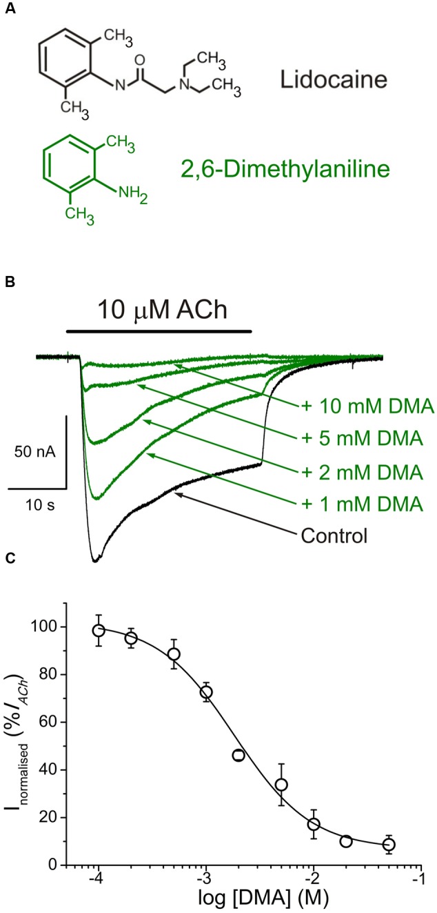 FIGURE 1. 2,6-Dimethylaniline (DMA) inhibits ACh-induced currents (IAChs). (A) Molecular structures of lidocaine and DMA, showing the resemblance of DMA to the phenolic ring of lidocaine. (B) Superimposed IAChs, recorded in the same nAChR-bearing oocyte, by application of 10 μM ACh either alone (Control) or together with DMA, at the indicated concentrations. In this and following figures, unless otherwise stated, the holding potential was -60 mV, downward deflections denote inward currents and the horizontal bar above records corresponds to the timing of drug application. (C) DMA concentration-IACh inhibition relationship. Amplitude of the IAChs evoked in presence of DMA was normalized to the IACh elicited by ACh alone (Control) and plotted as a function of the logarithm of the DMA concentration. Solid line is a sigmoid curve fitted to the data and error bars are SEM. Each point is the average of 4â28 oocytes from 3 to 13 frogs. |