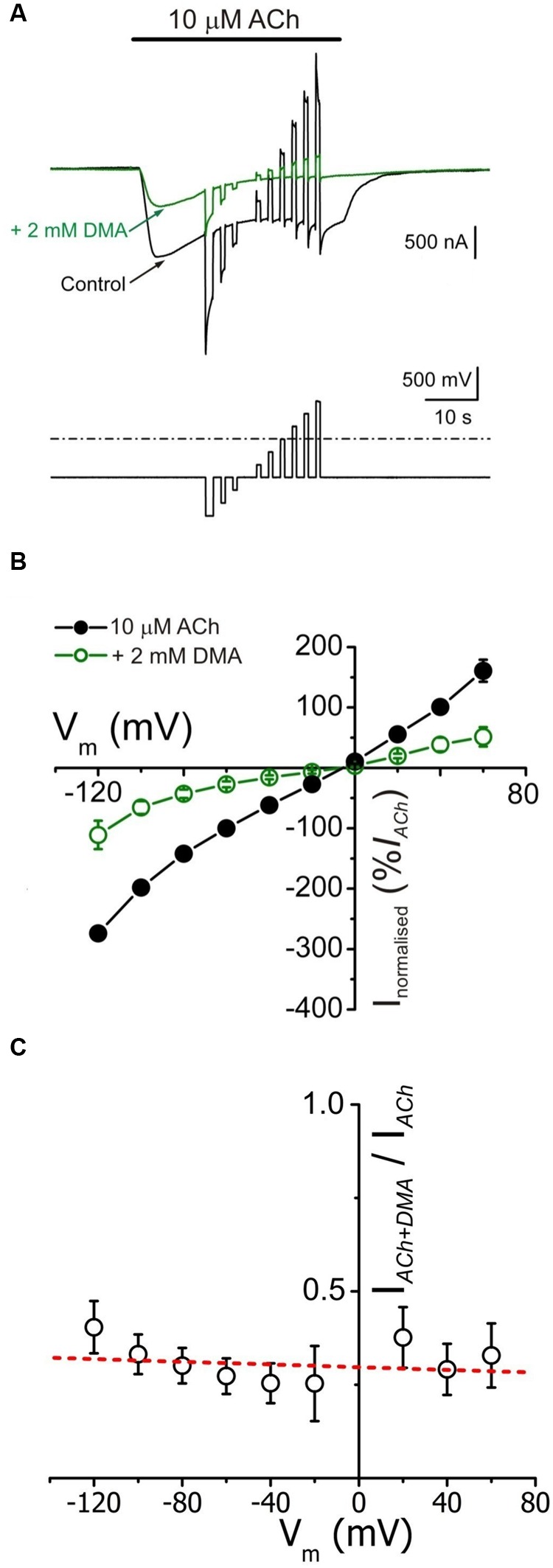 FIGURE 3. IACh blockade by DMA lacks of voltage dependence. (A) Whole membrane currents (upper traces) evoked by applying to an oocyte the voltage protocol shown on bottom, during the current plateau elicited by 10 μM ACh, either alone (black) or with 2 mM DMA (green). (B) Net i/v relationships for IACh, obtained by applying the voltage protocol shown in (A) while superfusing the cells with 10 μM ACh either alone (black filled circles) or co-applied with 2 mM DMA (green open circles). Values represent the percentage of current referred to their control IACh at -60 mV; each point is the average of 5 cells (N = 3). (C) Plot showing the fraction of plateau IACh left by 2 mM DMA (IACh+DMA), normalized to its control (IACh), versus the membrane potential. Same cells than in (B). Note the lack of a clear voltage dependence of IACh blockade by DMA. The dashed red line shows the best linear fit to the data; the fitted line has a correlation coefficient of -0.21, giving a p of 0.58 (the probability for the t-test of the slope = 0). |
