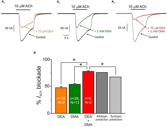 FIGURE 8. Additive inhibitory effects of DMA and DEA on IACh. (A1âA3) Representative IACh recordings obtained when superfusing the oocyte with 10 μM ACh either alone (A1âA3; Control, black) or co-applied with 70 μM DEA (A1; + 70 μM DEA, orange), 2 mM DMA (A2; + 2 mM DMA, green) or 70 μM DEA plus 2 mM DMA (A3; + 70 μM DEA + 2 mM DMA, red). (B) Column graph showing the average IACh inhibition elicited by co-application of 10 μM ACh with the different combinations showed in (A) as indicated below each column. The two right most columns show the values predicted by the allotopic and syntopic models of interaction (see text for details). The asterisks above the bars indicate significant differences between groups (p < 0.05, t-test; comparisons of DEA + DMA values with those estimated by each model of inhibition were carried out with one-sample t-test). |