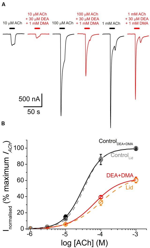 FIGURE 9. Similar pharmacological profile of nAChRs in the presence of either combined DEA and DMA or lidocaine. (A)