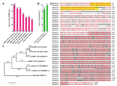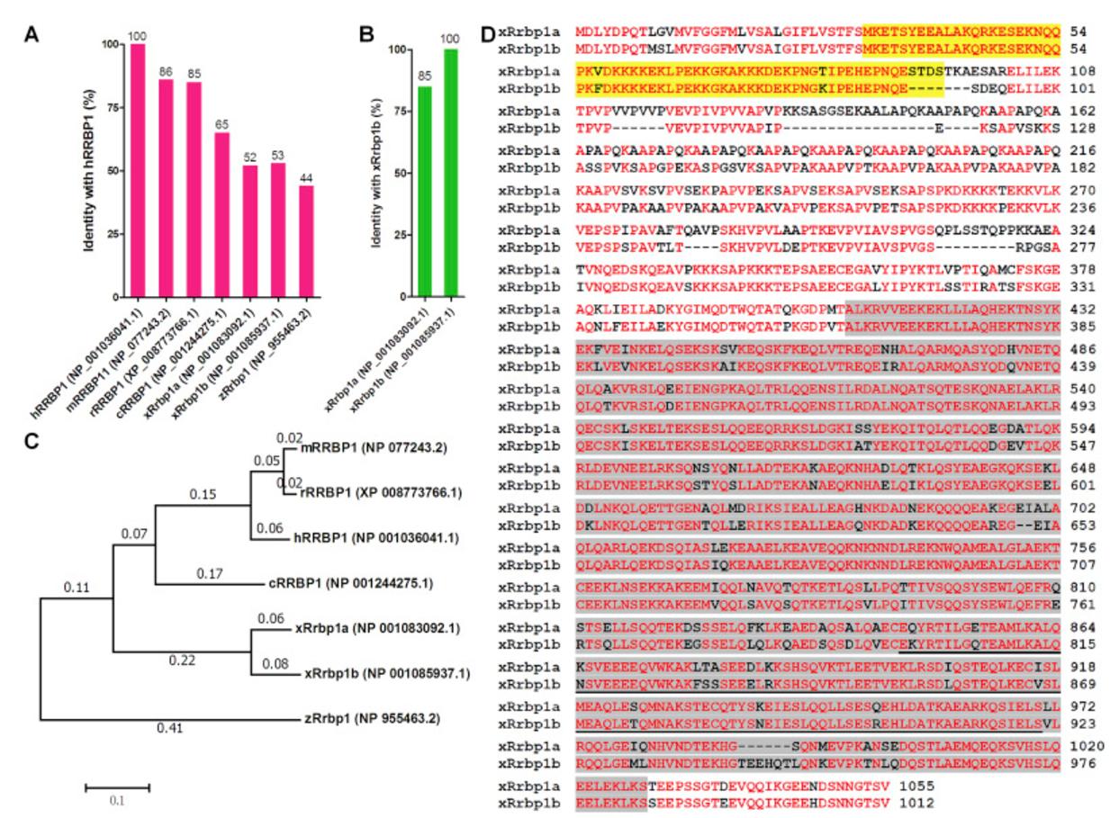 Identification of two rrbp1 genes from Xenopus laevis. (A and B) Protein sequence identities of human RRBP1 with homologs in other vertebrates. M, mouse; r, rat; c, chicken; x, Xenopus; z, zebrafish. (C) Phylogenetic analysis of ribosome-binding protein 1 from Xenopus, human, mouse, rat, chicken and zebrafish. (D) Protein sequence alignment of Xenopus Rrbp1a and Rrbp1b. Identical amino acids are highlighted using red color. Conserved domain of ribosome receptor lysine/proline rich region (Rib_recp_KP_reg) and chromosome segregation protein SMC (SMC_prok_B) are highlighted in yellow and in grey, respectively. The polyhydroxyalkanoic acid synthase (phaR_Bmeg) is underlined.