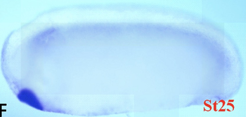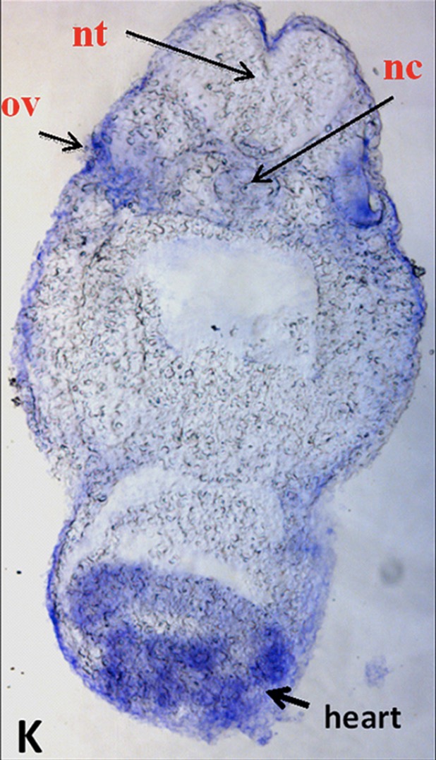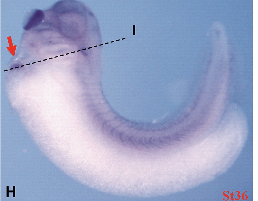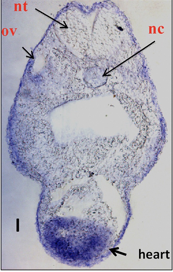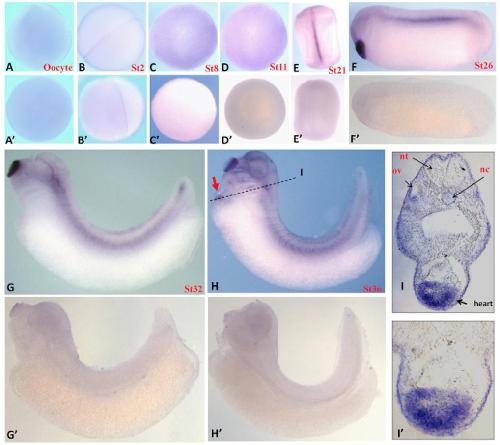 Fig. 3. Spatial patterns of rrbp1b analyzed by whole mount in situ hybridization. (A and Aâ²) Oocyte. (B and Bâ²) Stage 2, animal view. (C and Câ²) Stage 8, animal view. (D and Dâ²) Stage 11, animal view. (E and Eâ²) Stage 21, dorsal view. (F and Fâ²) Stage 26, lateral view. (G and Gâ²) Stage 32, lateral view. (H and Hâ²) Stage 36, lateral view. The red arrow indicates the heart promodium. (I and Iâ²) Transverse sections of embryos at the levels illustrated by black broken lines in H. Iâ² is the higher magnification of heart promodium region in I. Nc, notochord; nt, neural tube; ov, otic vesicle. Aâ²-Hâ² indicates the sense probe control.