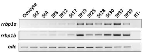 Expression profile of rrbp1 genes during embryonic development and in adult tissues of Xenopus laevis.