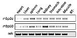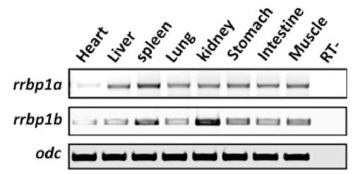 Expression of rrbp1 genes in adult tissues of Xenopus laevis. The mRNA expression of rrbp1a and rrbp1b genes in adult tissues was analyzed by RT-PCR. Odc was used as the internal standard control.