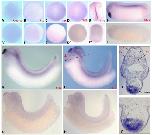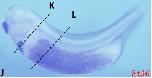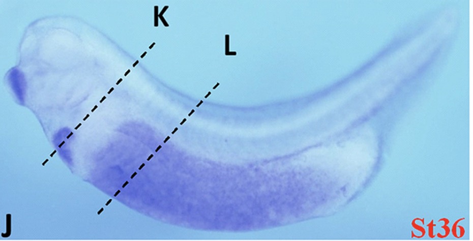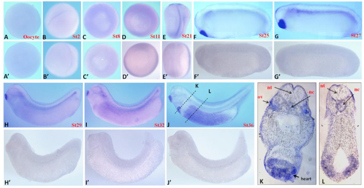 Fig. 2. Spatial patterns of rrbp1a [rrbp1.L] analyzed by whole mount in situ hybridization. (A and Aâ²) Oocyte. (B and Bâ²) Stage 2, animal view. (C and Câ²) Stage 8, animal view. (D and Dâ²) Stage 11, vegetal view. (E and Eâ²) Stage 21, dorsal view. (F and Fâ²) Stage 25, lateral view. (G and Gâ²) Stage 27, dorsal view. (H and Hâ²) Stage 29, lateral view. (I and Iâ²) Stage 32, lateral view. (J and Jâ²) Stage 36, lateral view. (K and L) Transverse sections of embryos at the levels illustrated by black broken lines in J. Nc, notochord; nt, neural tube; ov, otic vesicle. Aâ²-Jâ² indicates the sense probe control.