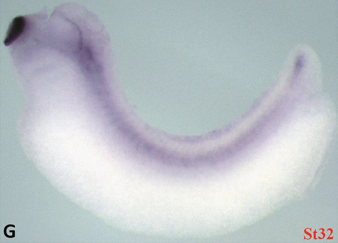 rrbp1.S (ribosome binding protein 1 S homeolog) gene expression in Xenopus laevis embryo, assayed via in situ hybridization, NF stage 32, lateral view, anteriorleft, dorsal up.