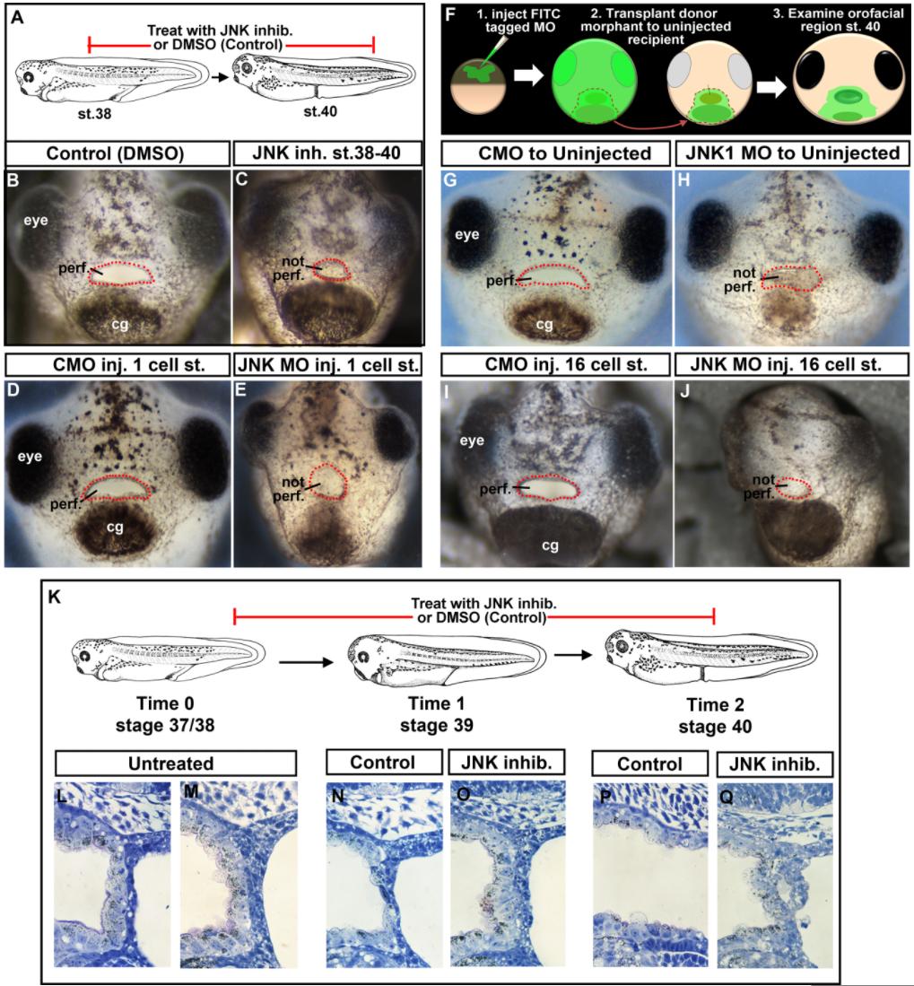 Figure 1. A: Schematic showing treatment paradigm. B: Frontal view of a representative Control treated with 1% DMSO. C: Frontal view of a representative embryo treated with JNK inhibitor. D: Frontal view of a representative embryo injected with control morpholino at the 1 cell stage. E: Frontal view of a representative embryo injected with JNK1 morpholino at the 1 cell stage. F: Schematic showing face transplant paradigm. G: Frontal view of a representative control transplant. H: Frontal view of a representative embryo with JNK1 morphant tissue transplanted to its orofacial region. I: Frontal view of a representative embryo with control morpholino injected into D12 blastomere at the 16 cell stage. J: Frontal view of a representative embryo with JNK1 morpholino injected into D12 blastomere at the 16 cell stage. K: A schematic of the JNK inhibitor treatment paradigm and stages examined by histology. L,M: Shows sagittal sections through the buccopharyngeal membrane just before JNK inhibitor treatment at stage 37/38 (two representative images). N,O: Shows sagittal sections through the buccopharyngeal membrane at stage 39 in controls (N) and JNK inhibitor treated (O). P,Q: Shows sagittal sections through the buccopharyngeal membrane at stage 40 in controls (N) and JNK inhibitor treated. perf, perforated; cg, cement gland; inj, injected; MO, morpholino; st, stage. Red dots outline the embryonic mouth. |