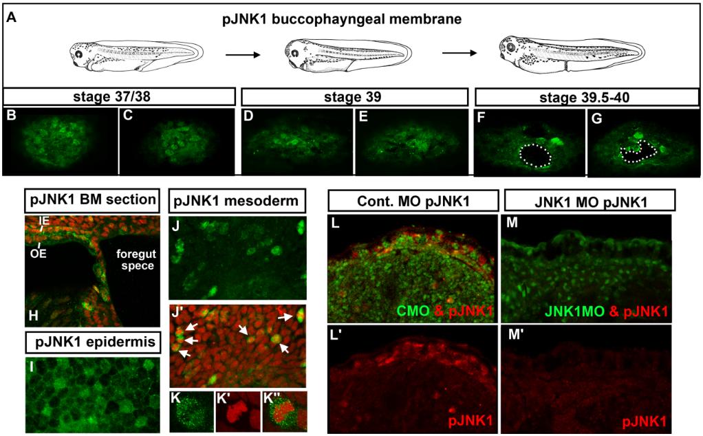 Figure 2. AâG: Frontal views of the buccopharyngeal membrane labeled with pJNK1 antibody (green) at three different stages representing before and during perforation. White dots outline âholesâ or perforations. H: Sagittal section through the buccopharyngeal membrane and surrounding face showing pJNK (green) and counterstained with propidium iodide. pJNK can also be observed in the two layered epidermis, in the outer epidermis (OE) and inner epidermis (IE). I: Flat mount of the epidermis labeled with pJNK antibody (green). J: The mesoderm labeled with pJNK antibody (green). Jâ²) Corresponding image to J where the pJNK is labeled green and nuclei/DNA labeled with propidium iodide (red). White arrows indicate examples of cells that appear to be undergoing mitosis. K: Magnified image of a mesodermal cell labeled with pJNK antibody (green) (Kâ²) corresponding cell from K labeled with propidium iodide to show DNA (red). Kâ²: Cell corresponding to K showing a merge of pJNK (green) and DNA (red). L: Embryos labeled with pJNK antibody (red) and showing the fluorescein tagged control morpholino (green). Lâ²: Same image as L showing only the pJNK labeling (red). M: Embryos labeled with pJNK antibody (red) and showing the fluorescein tagged JNK1 morpholino (green) Mâ²: Same image as H showing only the pJNK labeling (red). pJNK1, phospho JNK1; st, stage. |