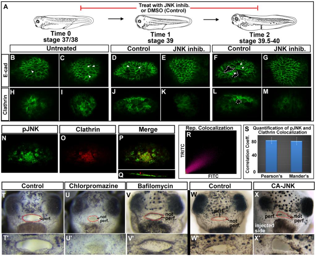 Figure 6. A: Schematic of the stages examined during buccopharyngeal perforation. BâG: Frontal views of the buccopharyngeal membrane labeled with E-cadherin in control and JNK inhibitor treated embryos. White arrows point to examples of cells with an increase in cytoplasmic labeling and white arrow heads indicate lower E-cadherin at the membrane. White dots outline the holes or perforation. HâM: Frontal views of the buccopharyngeal membrane labeled with clathrin in control and JNK inhibitor treated embryos. White dots outline the holes or perforation. NâS: Colocalization experiment with phospho-JNK (green) and clathrin (red). N: pJNK1 in green. O: Clathrin in red. P: Merge of pJNK1 and clathrin. Q: Volume rendered image of pJNK and clathrin co-labeling rotated 45 degrees. R: Scatterplot of pixels labeled in green vs. red in the image shown in P. S: Bar graphs of the average correlation coefficients for Pearson's and Mander's colocalization tests. TâX: Frontal views of the entire faces (regular letters) or only the buccopharyngeal membrane at two-fold magnification (prime letters) from representative embryos at stage 40â41. T,Tâ²: Representative control embryo treated with DMSO. U,Uâ²: Representative embryo treated with chlorpromazine. V,Vâ²: Representative embryo treated with Bafilomycin. W,Wâ²: Representative uninjected embryo. X,Xâ²: Embryo injected with CA-JNK. Abbreviations: perf, perforated; cg, cement gland; CA-JNK, constitutively active JNK. Red dots outline the embryonic mouth. |