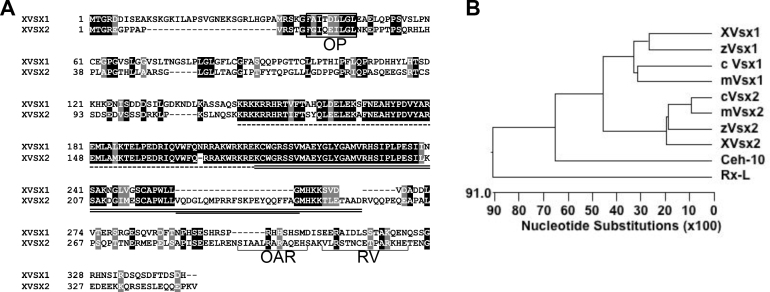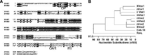 Figure 1. Identification of Xenopus laevis Vsx1 and Vsx2. A: Predicted protein sequences of X. laevis Vsx1 and Vsx2. Sequences were aligned using ClustalW. The black and gray backgrounds indicate amino acid identity and similarity, respectively. The highly conserved octapeptide motif (OP; box), homeodomain (dashed line), and CVC domain (double underline) are indicated. The orthopedia-aristaless-Rx (OAR; Vsx2) and Rinx-Vsx1 (RV; Vsx1) domains are also indicated. The triple underline indicates the region of Vsx2 lacking from the short form. B: Phylogenetic representation of ClustalW alignment of the Vsx1 and Vsx2 amino acid sequences from X. laevis, zebrafish, chicken, and mouse, Caenorhabditis elegans Ceh-10, and X. laevis Rx-L.