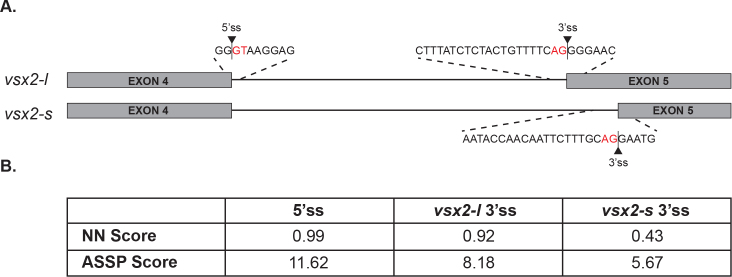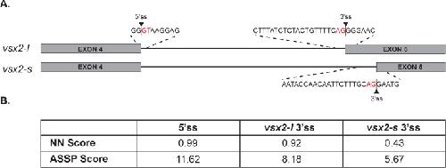 Figure 2. vsx2 undergoes alternative splicing of exon 5. A: A graphic depiction of the long (vsx2-l) and short (vsx2-s) forms of vsx2 showing alternative 3′ splice site use in intron 4. The locations and sequences of the splice sites (arrow; red text) are indicated by their position relative to the exons (gray boxes) and intron (black lines). B: The splice site matrix scores of the splicing signals found in intron 4 according to the Neural Network (NN) and Alternative Splice Site Predictor (ASSP) bioinformatics programs. Both programs recognize vsx2-l as a strong 3′ splice site (high homology to consensus splicing signals) of intron 4 and vsx2-s as a weaker 3′ acceptor splice site (intermediate homology to splicing signals) for intron 4. ss, splice site.