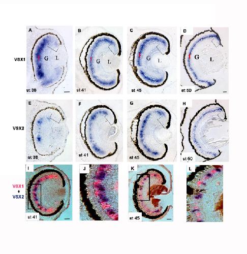 Figure 3. vsx1 and vsx2 are expressed in the INL of the maturing Xenopus laevis retina. A–H: Expression of vsx1 (A–D) and vsx2 (E–H) at st 38, 41, 45, and 50 (as indicated). Brackets indicate the ciliary marginal zone (CMZ). I–L: Overlapping expression of vsx1 and vsx2 decreases as the retina matures. Double in situ hybridization was performed on sections prepared from paraffin-embedded tadpoles using differently labeled probes for vsx1 (red) and vsx2 (blue). I, inner nuclear layer; G, ganglion cell layer; L, lens. Scale bars = 1 µM. Scale bar in A applies to B, C, E, F, and G; scale bar in D applies to H.