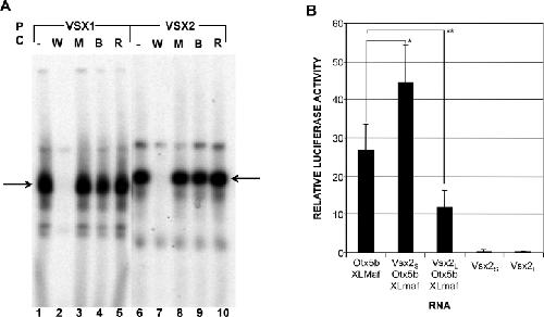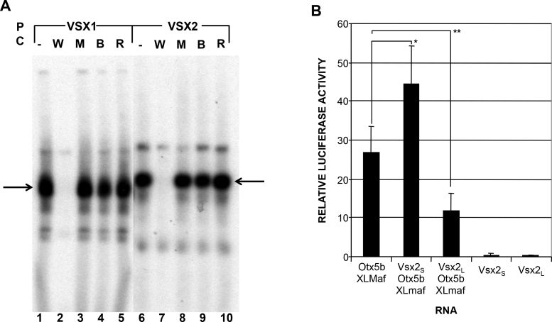 Figure 4. DNA binding activity of Vsx1 and 2 and transcriptional transactivation activity of Vsx2 isoforms. A: Vsx1 and Vsx2 can bind the photoreceptor conserved element-1 (PCE-1) site in vitro. Electrophoretic mobility shift assay (EMSA) performed using a radiolabeled PCE-1 probe, in vitro translated Vsx1 or Vsx2 proteins, and unlabeled wild-type (W) or mutant (M) PCE-1, BAT (B), or Ret4 (R) oligonucleotide competitors. Arrows indicate specific DNA–protein complexes. B: Vsx2L, but not Vsx2S, inhibits activation of XOP-Luc by otx5b and XLmaf. The luciferase assay was performed using lysates from embryos coinjected with the XOP-Luc reporter plasmid and otx5b + XLmaf and/or Vsx2L or Vsx2S RNAs as shown. Values are presented as fold mean normalized luciferase activity (relative to the reporter only, no effector control); error bars denote standard deviation from the mean. P, protein; C, competitor. * p<0.03; ** p<0.01.