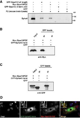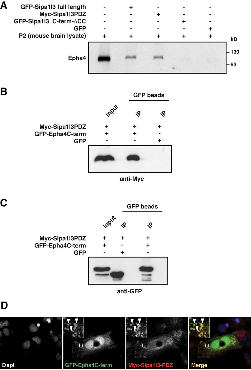 Fig. 3. Sipa1l3/Epha4 interaction. (A) Pulldown experiments using immunoprecipitated full-length GFP-Sipa1l3, Myc-Sipa1l3PDZ, GFP-Sipa1l3_C-term-CC, GFP and mouse brain lysate (P2 fraction) as indicated. Endogenous Epha4 was only pulled down by full-length GFP-Sipa1l3 and Myc-Sipa1l3PDZ. (B,C) Interaction of Sipa1l3 and Epha4 is shown by immunoprecipitation. (B) Anti-GFP beads were used for IP of the GFP-Epha4C-term/Myc-Sipa1l3PDZ interaction complex. Western blotting was performed with anti-Myc as indicated. (C) IP control was performed in an independent experiment with anti-GFP as indicated. (D) The interaction of Sipa1l3 and Epha4 was substantiated by co-transfection of both constructs in Cos7 cells followed by immunostaining with anti-Myc antibody. The GFP signal and the fluorescent staining of the Myc-tag show a complete overlay in cell clusters (white arrowheads). |