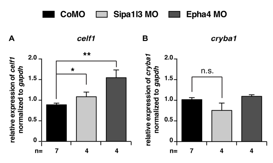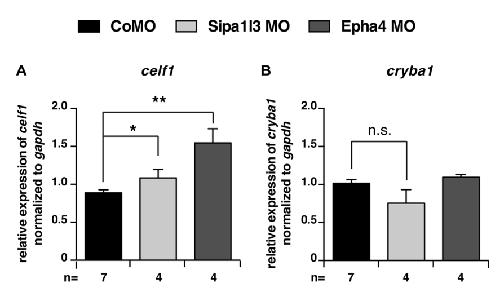 A celf1, a specific marker gene for mature LFCs, is significantly up-regulated by Sipa1l3 or Epha4 down-regulation. B cryba1, a marker of the lens epithelium, is not affected by neither Sipa1l3 nor Epha4 depletion. n, number of independent experiments; ng, nanogram; n.s., not significant. Error bars indicate standard error of the means (s.e.m.); * pï£0.05; ** pï£0.01. P-values were calculated by a nonparametric, one-tailed Mann-Whitney rank sum test. |