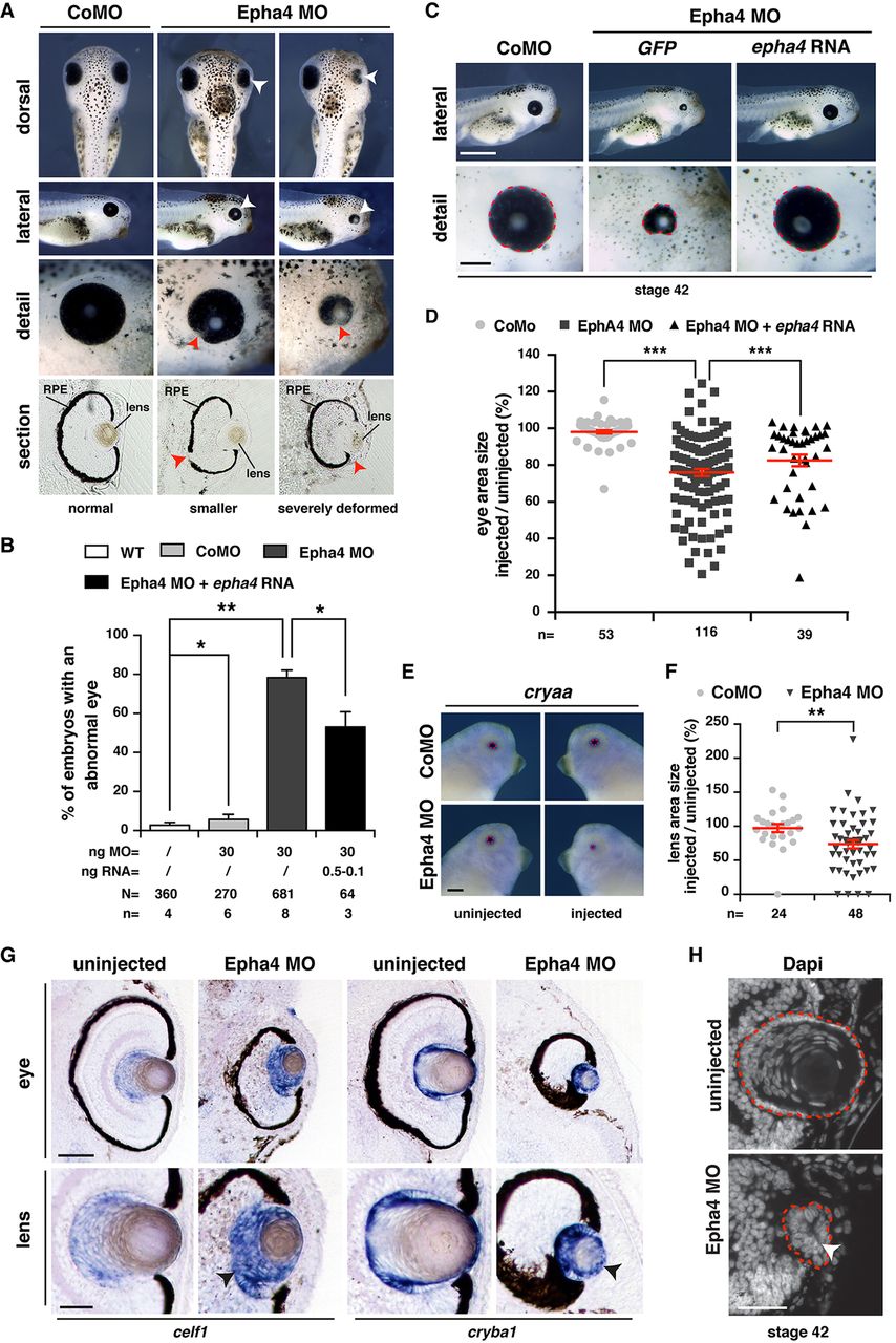 (H) DAPI staining on cryosections revealed nuclei in the lens after loss of Epha4 (injected side, white arrowhead), compared with internal control (uninjected side). The dotted lines indicate the lenses.