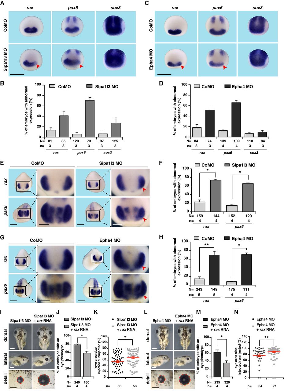µm in detail views. (J) Quantification of the data in I. (K) rax RNA rescues the Sipa1l3 MO-induced microphthalmia phenotype. (L) rax RNA restores the Epha4 MO-induced ocular phenotype. Red circles indicate eye areas. Scale bars: 500â