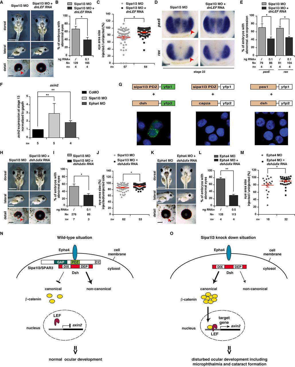 µm in detail view. (L) Quantification of the data in K. (M) Injection of dshδdix RNA restores the microphthalmia phenotype induced by Epha4 depletion. (N) Scheme of the predicted mechanism in the wild-type situation. Interaction of Epha4 and Sipa1l3 leads to normal ocular development by blocking Wnt/β-catenin signaling and activation of the non-canonical Wnt pathway. (O) Scheme of the predicted mechanism in the Sipa1l3 loss-of-function situation. Sipa1l3 deficiency results in eye defects by upregulation of β-catenin and axin2. N, number of analyzed embryos in total; n, number of independent experiments; ng, nanogram. Error bars indicate standard error of the means (s.e.m.); *Pâ¤0.05; **Pâ¤0.01. P-values were calculated by a nonparametric, one-tailed MannâWhitney rank sum test. |